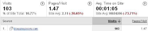 If I ignore the direct traffic and the search engines traffic, there are 604 visits from various referring sites. The 103 visits from BZ works out to a high proportion of 17% of the referring sites.